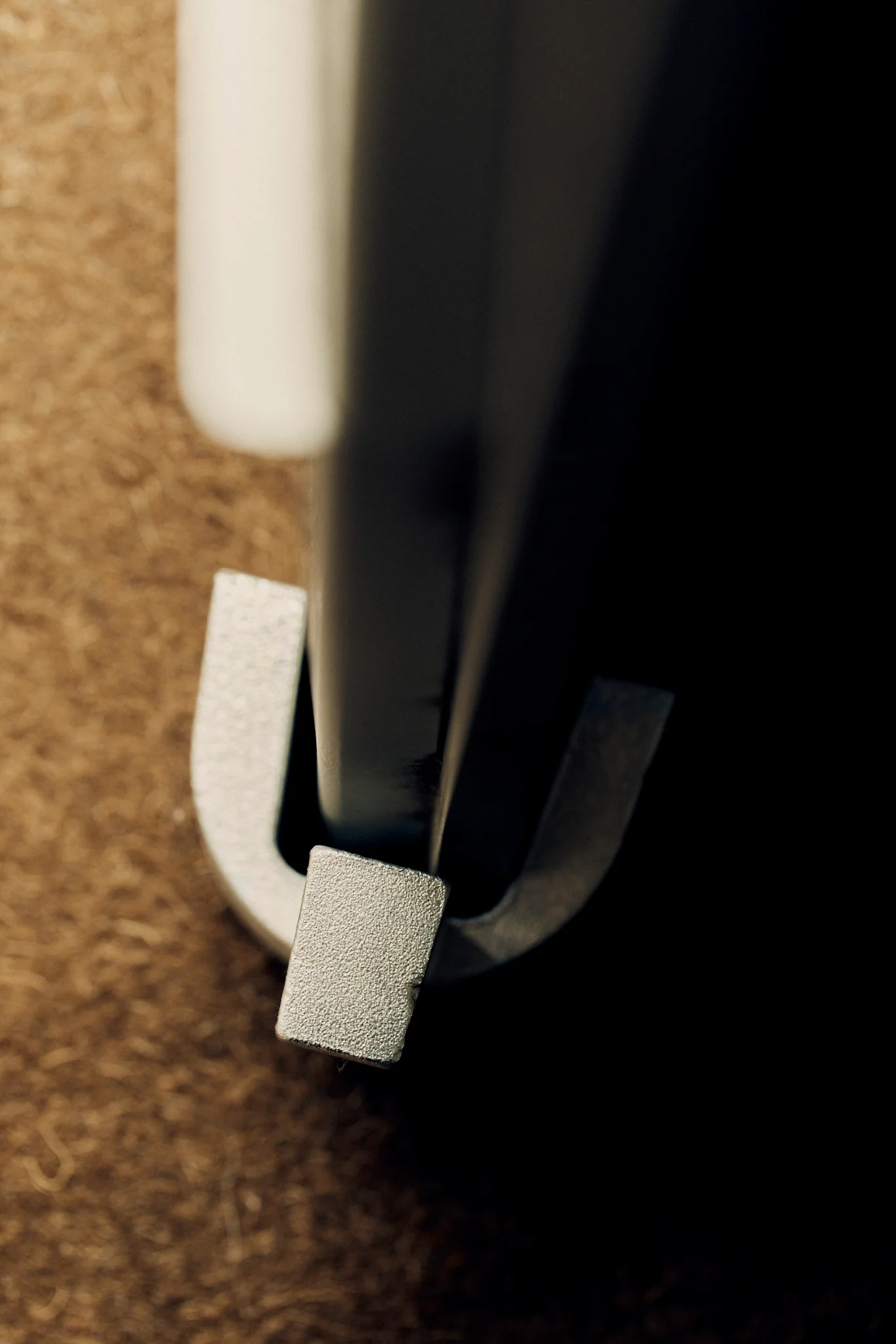 A door stop. Lug has been designed to ensconce the blade edge of the door in an embrace, holding it firmly in place with its prodigious weight whilst minimising its impact on the path of travel. The result of a brutally industrial process, Lug is cast in iron and then zinc plated to prevent corrosion. Aesthetically honest, Lug bears the scars of its manufacture. Each one unique in it's imperfection. Supplied with a die-cut felt pad foot for delicate floor finishes. Suitable for doors up to 55 mm wide. Made in Australia. Design : Henry Wilson & David Caon 2021